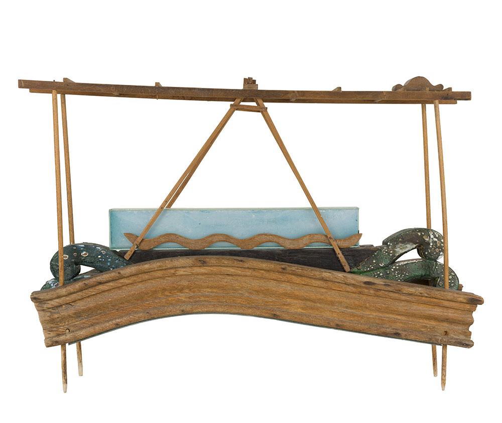 Esta pieza de 1991, titulada Cuna, representa un navío en madera que parece estar navegando, algo que nos habla por su interés en reflexionar sobre la historia de la civilización y la historia del ser humano, una idea que siempre ha estado latente en su producción.