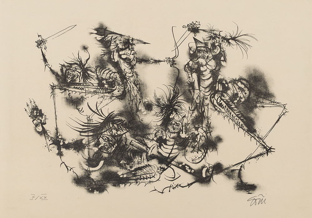 Admirador de escritores del pasado y de su tiempo, se declaraba heredero del pensamiento de Pío Baroja, a cuya obra hace referencia a menudo a través de su trabajo. En este grabado, fija la mirada en el pasado a la hora de representar, de forma onírica y dinámica, una suerte de Quijote envuelto en una especie de ensoñación, que parece luchar contra sí mismo, y que, parece evocar a reminiscencias de Arcimboldo.