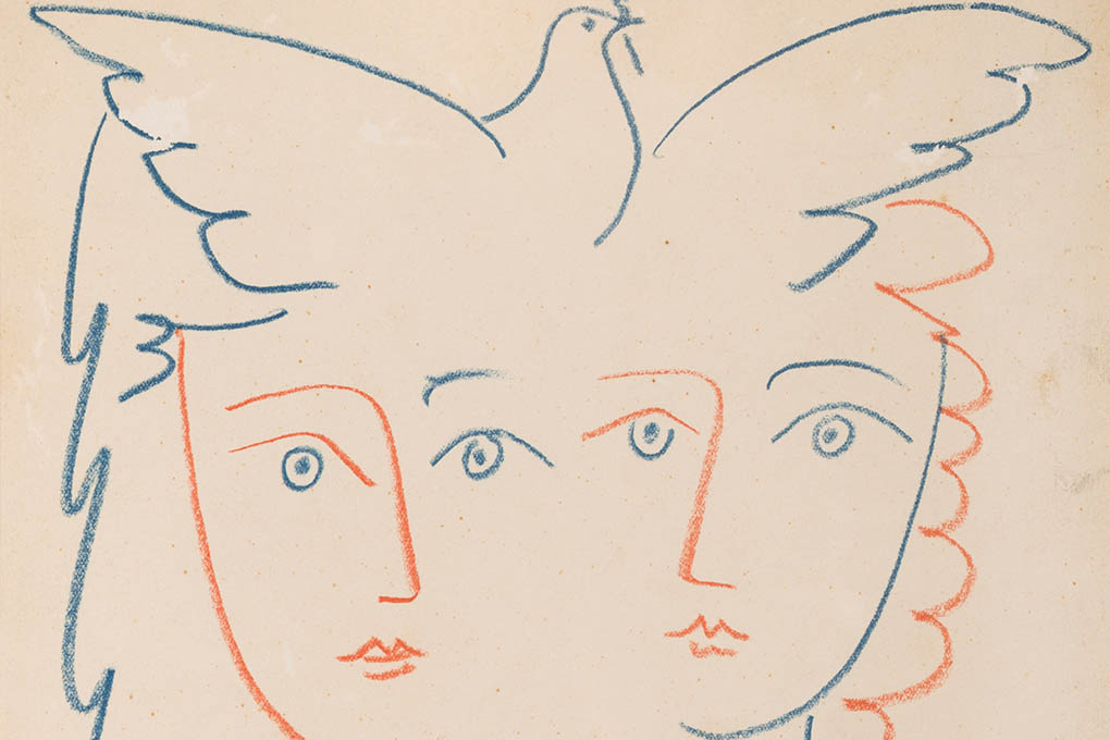 This piece may have been a gift from the painter. It is a two-color silkscreen with female faces traced with classic forms, joined by a dove with an olive branch, symbol of peace, very recurrent in Picasso.
