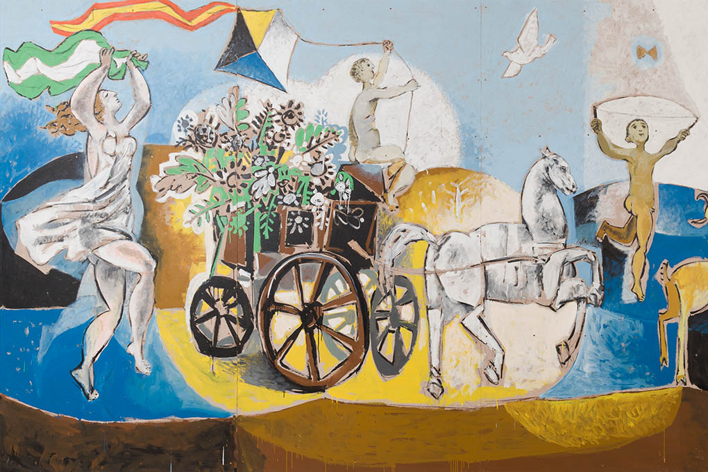 In the piece The Freedom Chariot, we observe traits that identify the artist. As a militant of the communist party, he created this large-format work to be exhibited in the streets during the party's campaign for the municipal elections of 1983. Picasso's imprint can be glimpsed in his figures. The countryside, freedom, equality, and peace, ideals that Francisco and his brother José María always defended, are represented.