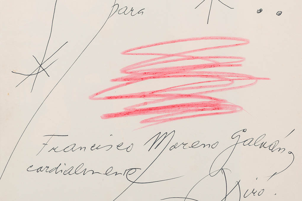 In this piece we see a dedication to his friend, Francisco Moreno Galván. Elements typical of children's imagery can be observed, such as the depiction of stars with simplified strokes. A red squiggle appears in the center of the composition with the typical gestures of abstraction. The nerve of life, along with the warmth provided by the color, give us clues of the warmth and affection that the artist shows towards his friend.