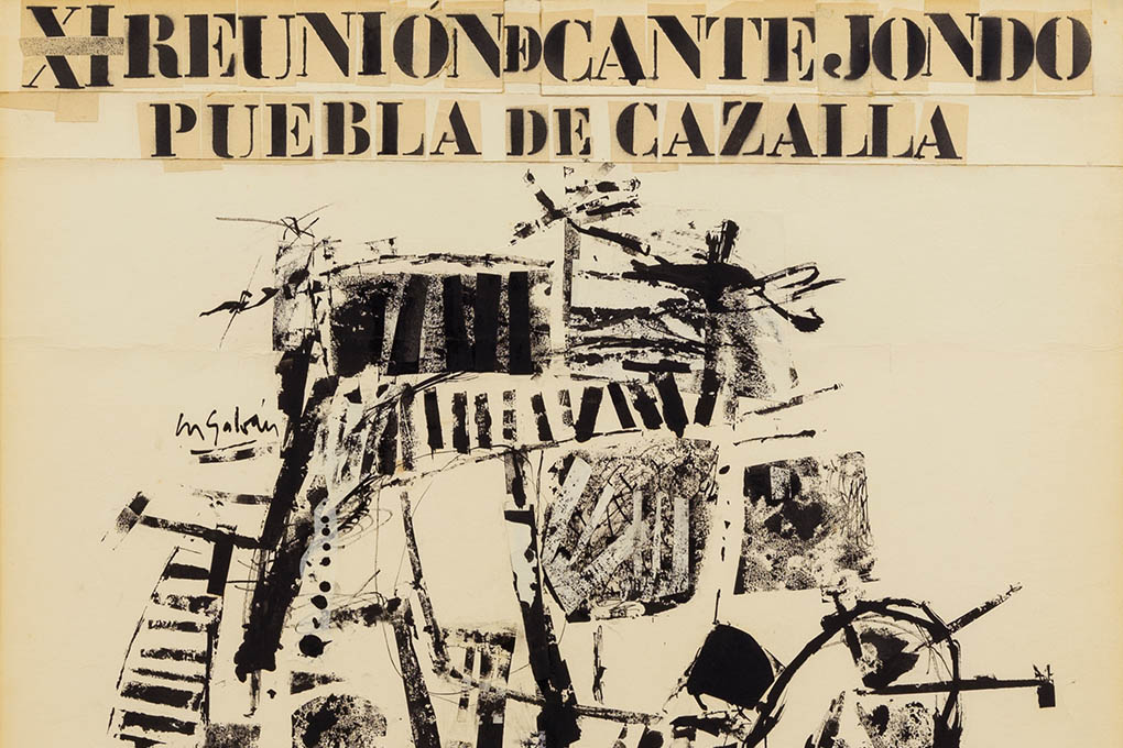 We are looking at some of the original posters made by Francisco Moreno Galván for the Cante Jondo Festival. He elevated the posters to the rank of art. In them he captured his apprenticeship during his stay in Madrid. Cubism, collage, the informalist dramatism of black and white, and certainty of stroke characterize these compositions. Singing, dancing, women, the guitar, silence, are part of the cultural heritage of flamenco that Francisco Moreno Galván included in his painting, with which he traced the aesthetics of the "cante jondo" (deep song). He himself defined flamenco as follows: