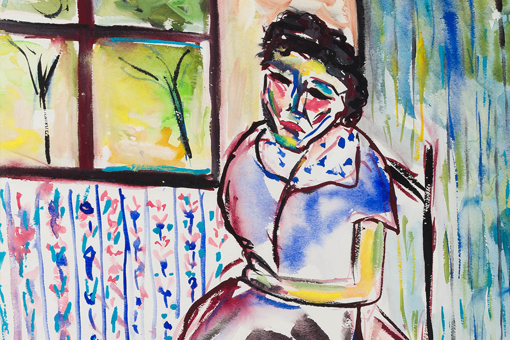 La mirada y postura corporal de la mujer transmiten melancolía. La perspectiva de la silla con respecto al espacio se encuentra forzada, aportando mayor dramatismo, algo que contrasta con el brillo de los colores de la composición.
