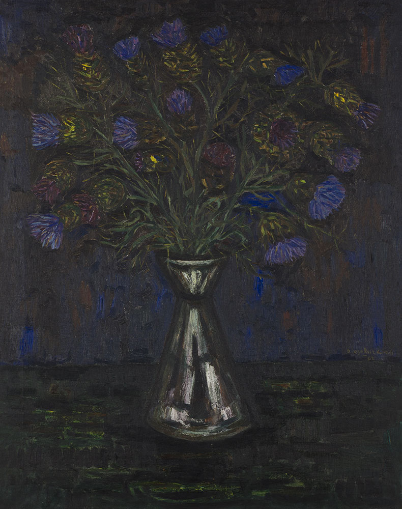 El paisaje que caracteriza a esta primera etapa, va tornándose a bodegón. Sin dejar de elogiar a la naturaleza, el artista va experimentando con la minuciosidad de las formas y con una paleta más fría, dejando patente que aún tiene muy presente a los grandes maestros del siglo XX en su estilo, reconocible en el momento por el uso de las líneas gruesas y contundentes que delimitan y componen espacios llenos de fuerza dentro del lienzo, como puede verse en la forma en que está resuelta el florero, lo que contrasta con la delicadeza con la que representa las flores que contiene.