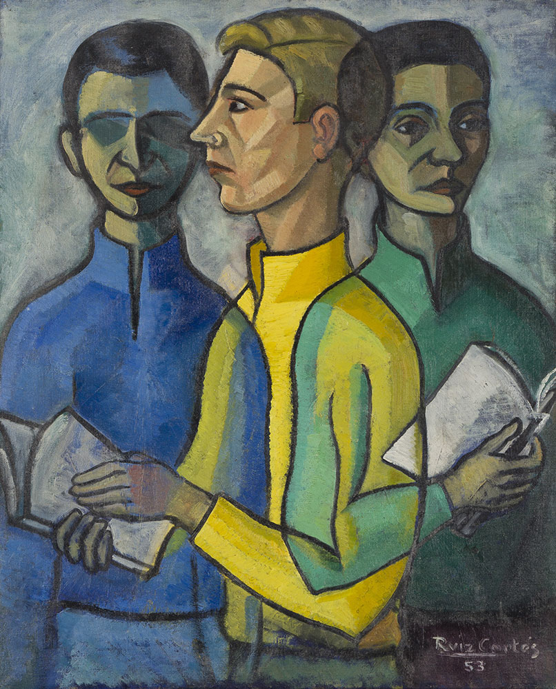 Uno de los pocos retratos en grupo, realizado con una interesante composición de las figuras de medio cuerpo, de perfil y de frente, que nos recuerda a Ortega Muñoz en la Visita de 1951, y a Picabia en la original transparencia en intersección de los cuerpos. Los trazos gruesos en el dibujo y los colores en tonos oscuros, son características generales de sus retratos en esta época de pertenencia al Club la Rábida.
