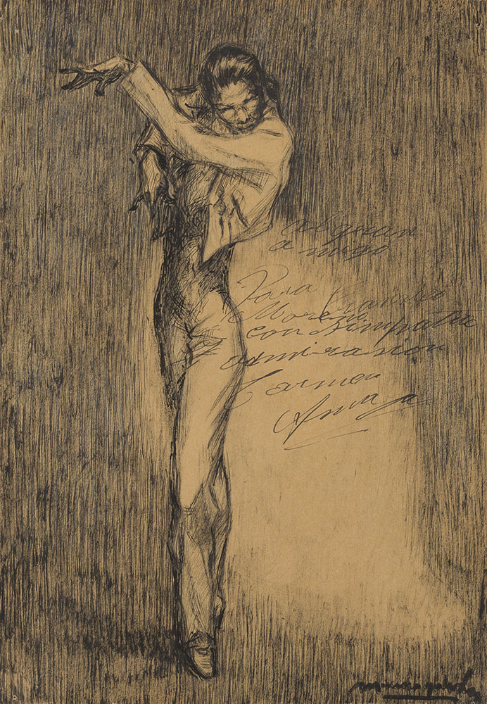En este dibujo representa a la bailaora flamenca Carmen Amaya en pleno acto de danza, vestida con chaqueta de corto y pantalón de tiro alto,” a lo masculino” lo que nos habla de una intención transgredir por parte de ambos artistas, un gesto que no era muy difícil que llevase a cabo Amaya, pionera en muchos aspectos del baile flamenco de su época.