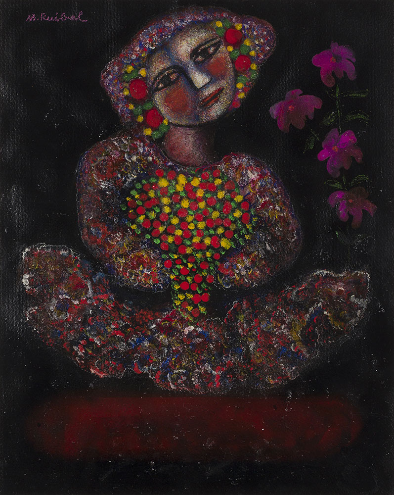 Con el paso de los años, su obra avanza hacia fondos negros con zonas de color brillante que crean claroscuros muy marcados, y también hacia un tratamiento más decorativo de las figuras, como sus mujeres con mantos y flores, como es el caso de esta Bailarina en malva, un buen ejemplo de este periodo, en el que la artista ya había obtenido gran reconocimiento, y cuyo personal estilo, supone un rasgo de identidad dentro de toda su carrera.