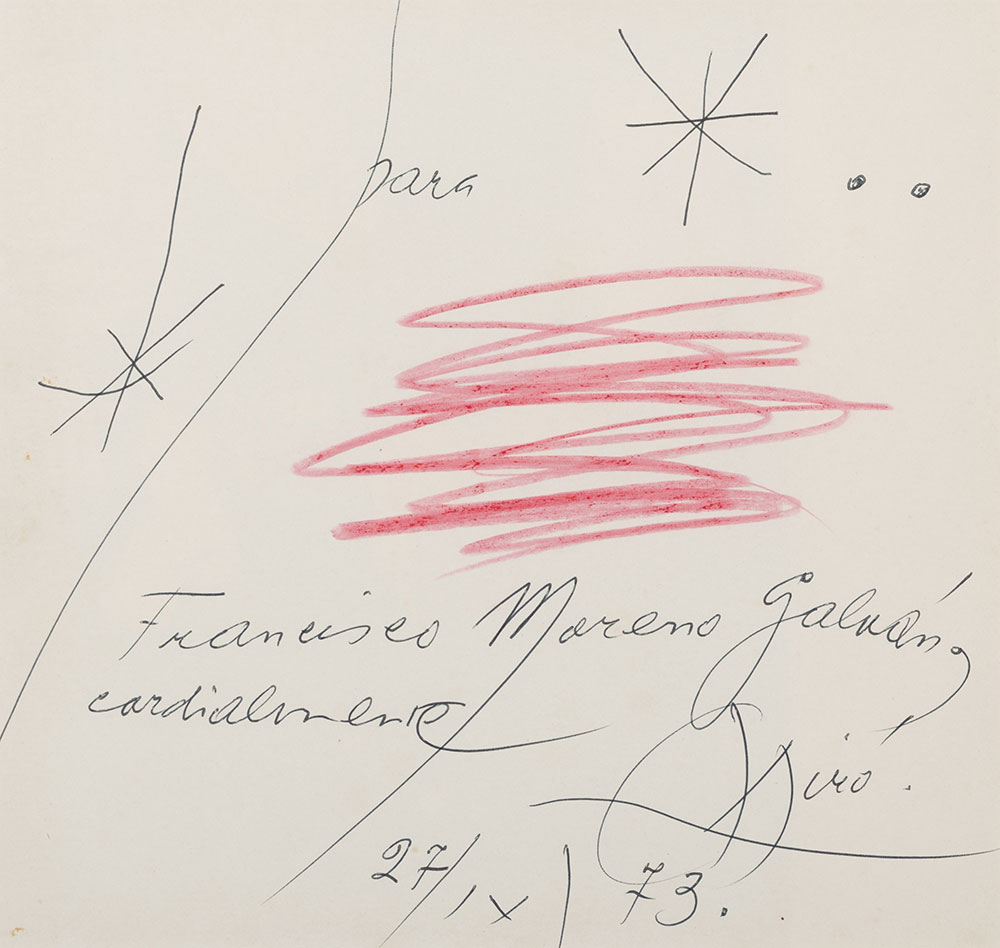 Fechado y firmado, presenta grafismos “infantiles” propios del genial artista catalán, y una clara dedicatoria del nombre al que se ha otorgado.