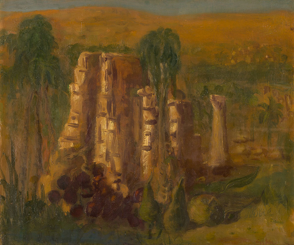Se trata de dos obras de carácter figurativo. Paisajes de Egipto en los que se representa un entorno cargado de simbología, con un horizonte alto y elementos que aluden a lo exótico y a la riqueza del lugar, como las piezas de fruta monumentales, palmeras o elementos arquitectónicos propios del enclave que representa.