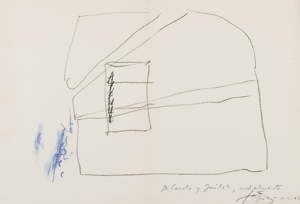 En este dibujo de Antoni Tápies se pone en valor precisamente una composición informe y sutil que culmina en su margen inferior derecho con una dedicatoria a José María (Moreno Galván) a quien le unió una gran amistad.