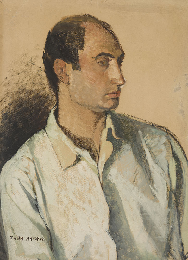Juan Antonio representa a un Moreno Galván joven, de perfil y sobre fondo neutro, llevado a cabo con una factura rápida y precisa, posiblemente realizado con pastel, sobre papel.