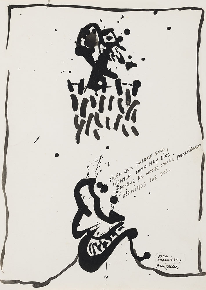En esta pieza, podemos observar su estilo y el magistral uso que hacía del grabado. Es una obra monocroma que presenta inscripción de un verso y también dedicatoria y firma en el margen inferior derecho.