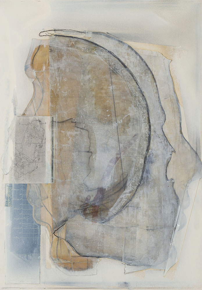 En esta pieza, vuelve a utilizar el fragmento y el collage para construir formas que crean metáforas conceptuales o empíricas sobre temas que le han interesado. En esta ocasión, utiliza inscripciones legibles que componen una especie de plano descifrable.