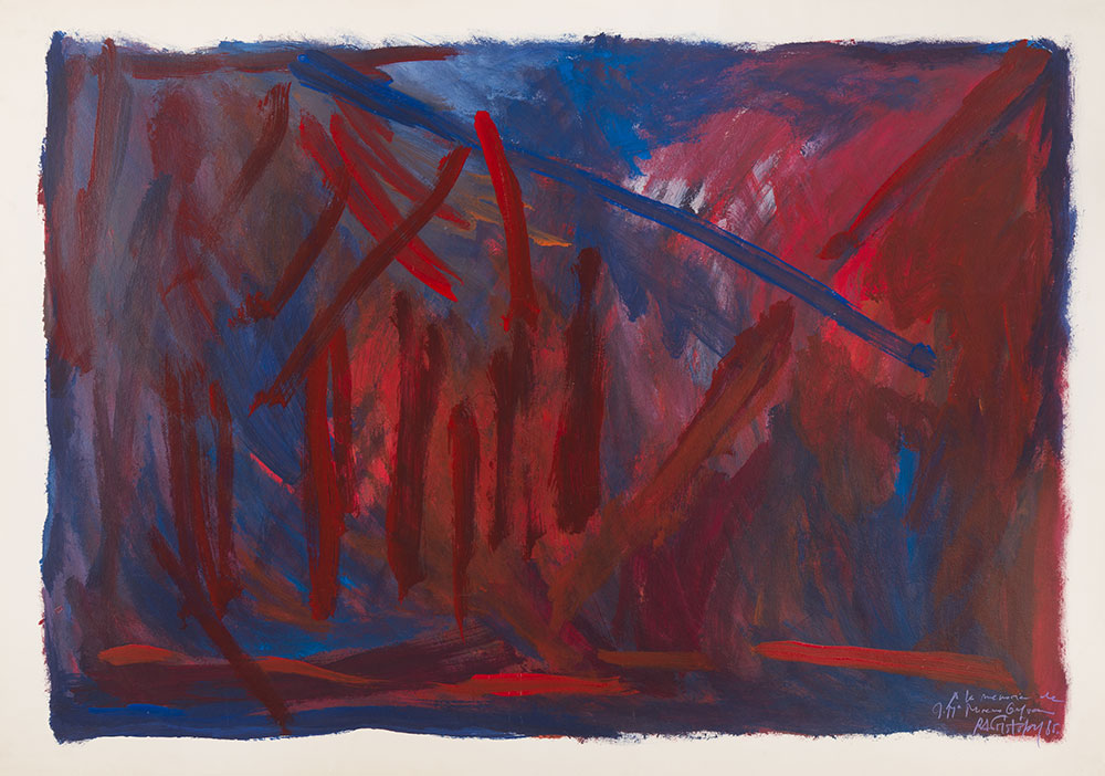 En 1984 tiñó de rojo el Duero a su paso por Aranda en homenaje a Salvador Allende en el décimo aniversario de su muerte tras el golpe de estado de Pinochet. Su obra, conceptual y abstracta, cuenta con un importante factor gestual, intuitivo y emocional. Contrapone colores complementarios dando mayor emoción a la obra. La pincelada, contundente y decidida nos habla de su gran dominio y decisión a la hora de poner la pintura. Estos factores, patentes en toda su producción, quedan totalmente manifiestos en este acrílico sobre papel.