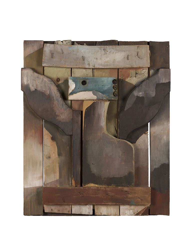 Podemos observar como a partir de varios listones de madera reconstruye cierta figuración abstraída a la que adjudicamos una morfología concreta apoyándonos en el título que le otorga el artista. Es destacable referirnos al inteligente uso de la cromía que hace, a partir de tonos naturales cuya intensidad crea sombras que delimitan los volúmenes, algo en lo que demuestra gran maestría, posiblemente por su gran dominio del arte vitral.