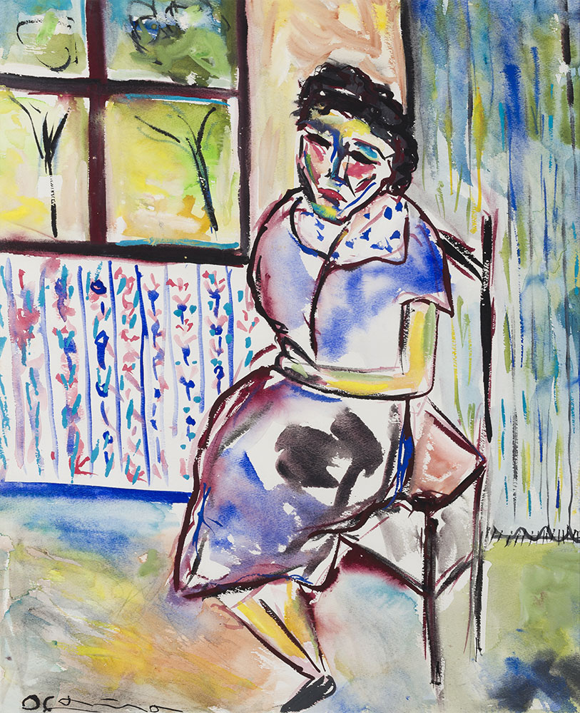 Abanderado de la idiosincrasia y la representación de su entorno cercano como reflejo de una sociedad que adoraba y detestaba por partes iguales, Ocaña representa una escena de interior, con una mujer sedente, una escena costumbrista de las habitualmente hacía, cuya factura y contenido revela la visión vanguardista que siempre le acompañó.