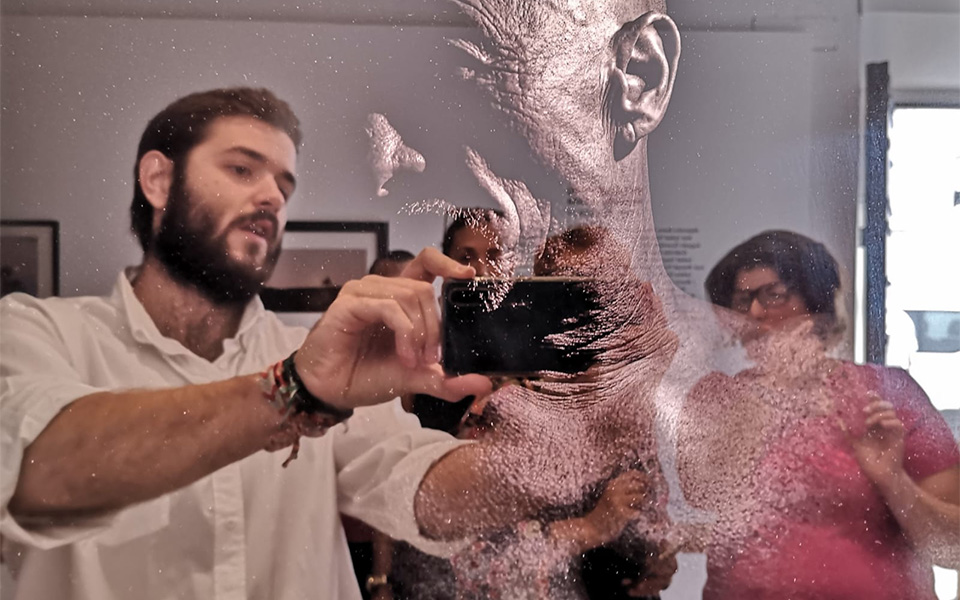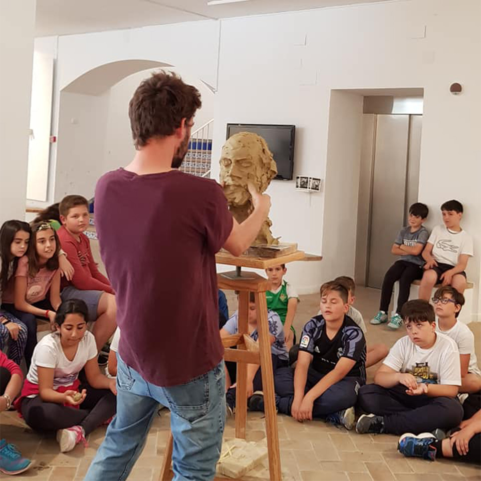 1. El propio escultor Martin Lagares muestra su proceso de creación a un grupo escolar, a través de un taller de modelado escultórico.