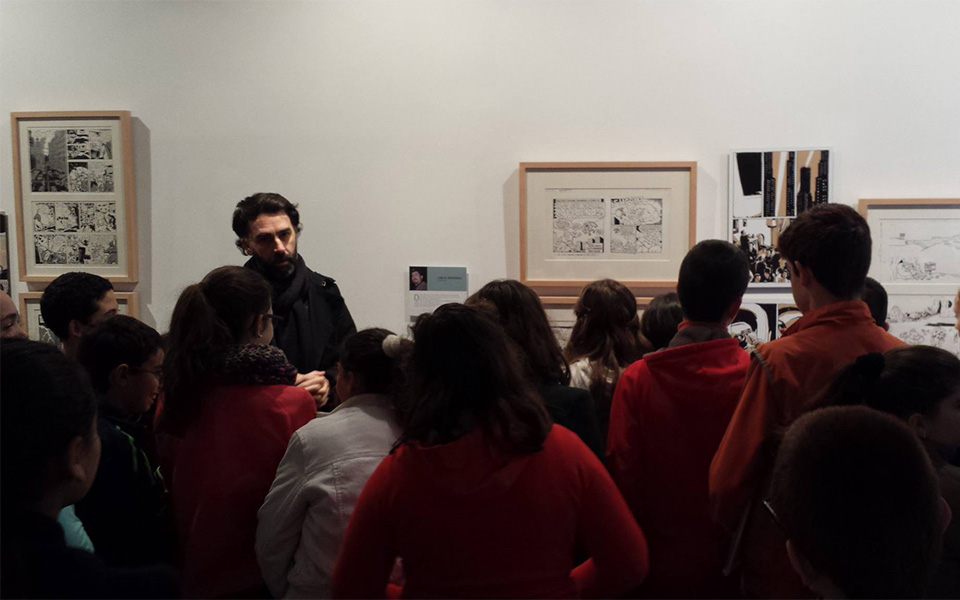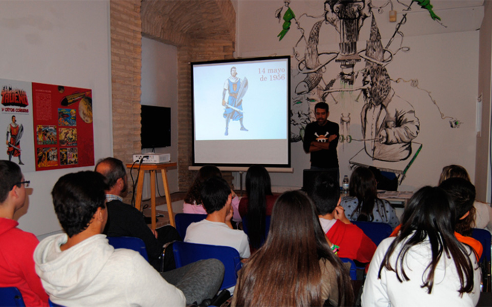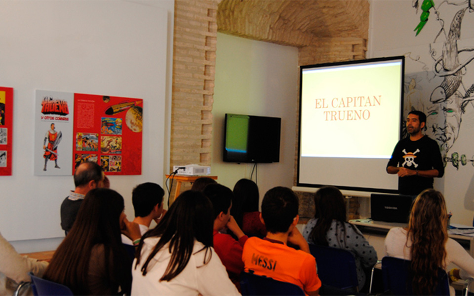 1. Interpretación de la exposición adaptada a grupos escolares por parte del ilustrador Francisco Cerrejón, en el que se les trasmite los códigos artísticos de la ilustración de José Luis Ágreda.