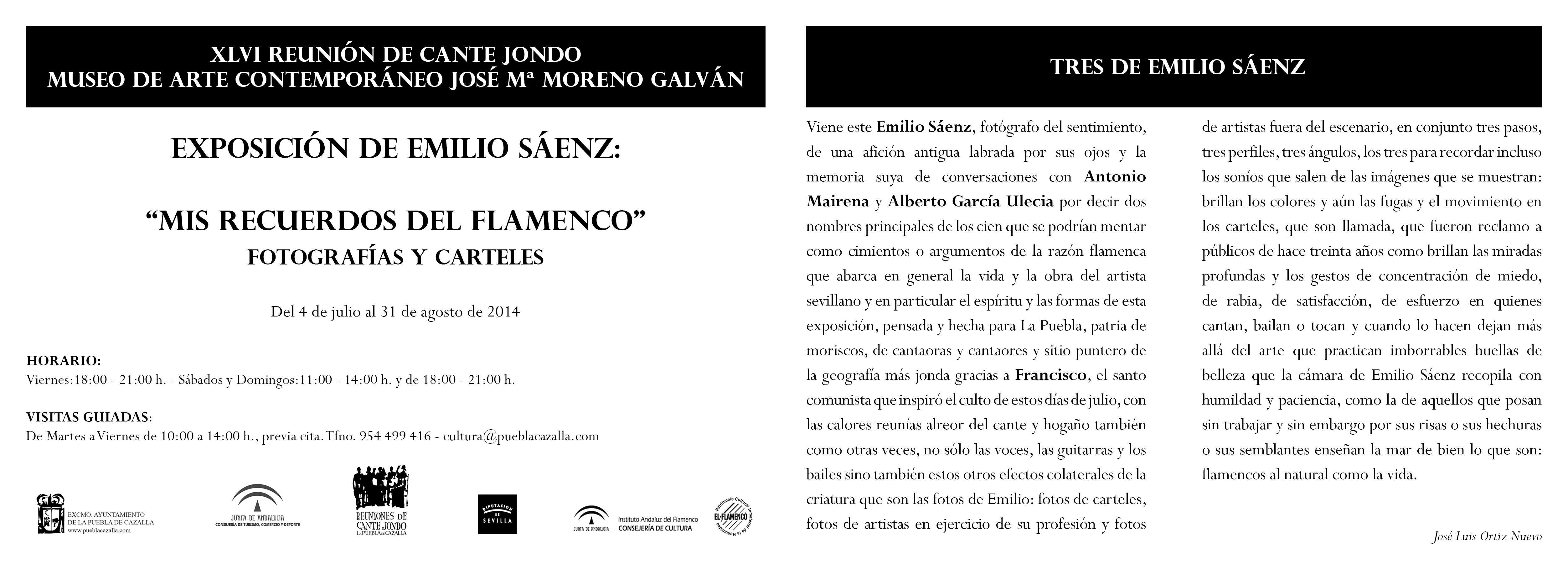 La fotografía de Emilio Sáenz recoge uno de los testimonios más logrados de la cultura popular andaluza y sevillana de la segunda mitad del siglo XX, como podemos apreciar en los catálogos Memoria íntima de Sevilla (1991), Figuras de la pasión (Premio Demófilo, 2003) o L ciudad oculta (2009). Otro de los territorios de su indagación fotográfica ha sido el flamenco, en torno al cual gira la presente exposición, titulada “Mis recuerdos del flamenco. Fotografías y carteles”, y que se exhibió el pasado verano en el Museo de Arte Contemporáneo José María Moreno Galván, dentro de los actos de la XLVI Reunión de Cante Jondo de La Puebla de Cazalla. En ella, Emilio Sáenz nos muestra su particular visión de los artistas flamencos, dentro y fuera de los escenarios, y parte de sus trabajos de cartelería. El resultado es un viaje que camina hacia esa edad de plata del flamenco que encarnaron Antonio Mairena, Matilde Coral, Fernanda de Utrera, María Soleá, Antonio Núñez "Chocolate", Pepa Montes, José Menese… Un viaje a los adentros del cante jondo, de la guitarra dolorida y el baile desgarrado, para el disfrute de los visitantes y amantes del arte flamenco.