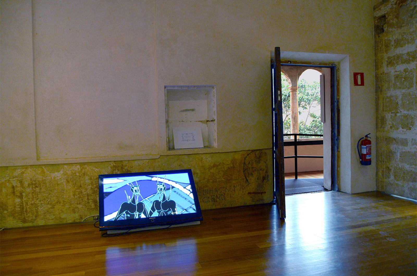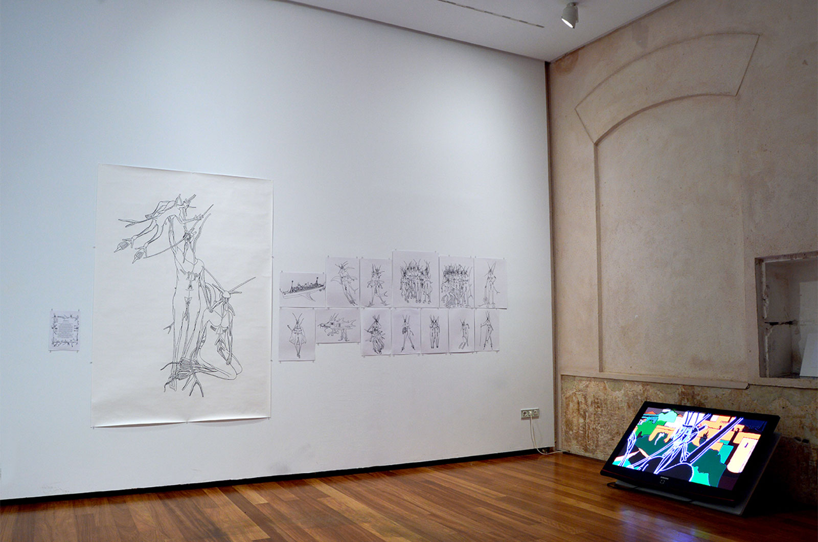 En un intento por comprender mejor su propio imaginario, la artista se esfuerza por generar una coherencia espacio temporal que soporte su ficción. Pero su forma de trabajar, donde lo concreto queda definido mucho antes que lo general, esquiva una lógica narrativa. Así sus personajes habitan simultáneamente pasado y presente. Otro aspecto que potencia la extrañeza del personaje, es la naturalidad con la que habita en una realidad reconocible. Fátima no ha creado un contexto aparte donde viven estas criaturas: Marcos se define desde el entorno histórico, cultural y religioso que ella conoce, pero donde los seres humanos parecen haber desaparecido por completo o no haber existido nunca.