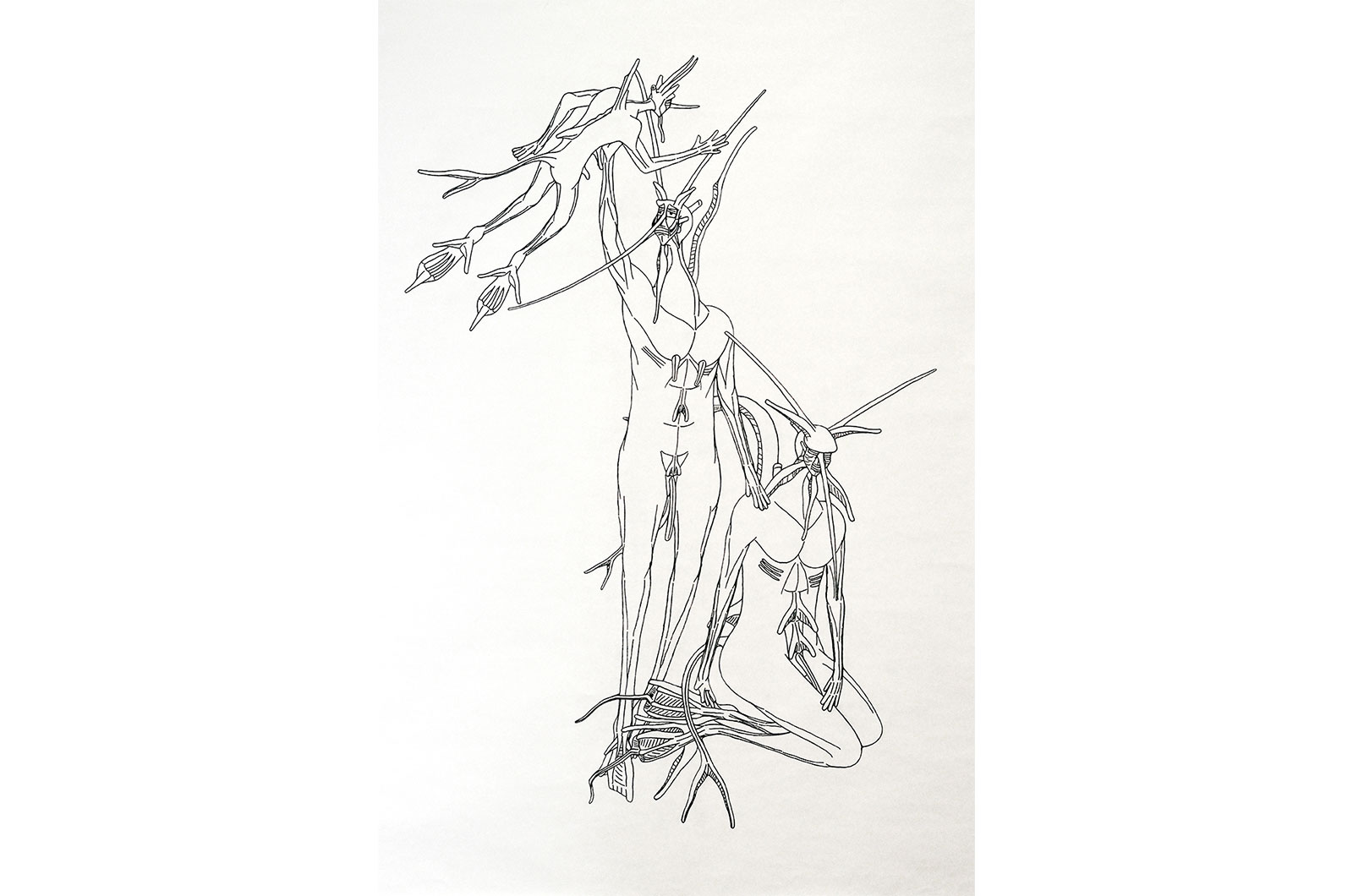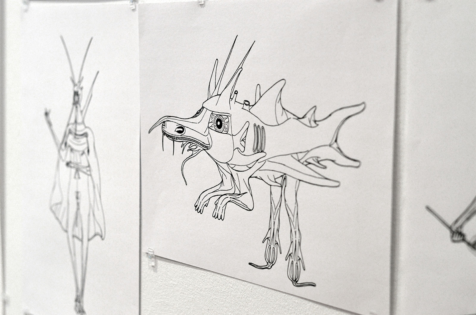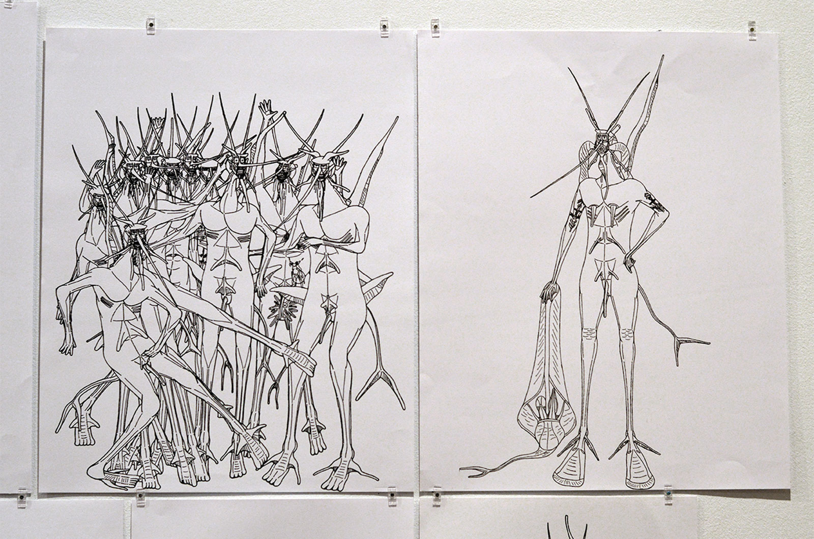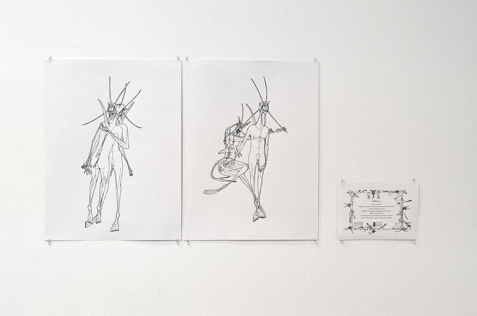 La necesidad de concretar y visualizar una imaginación desbordante, empuja a Fátima Calderón a iniciarse en el dibujo de manera autodidacta. Desde el 2002, la artista se centra en un solo proyecto basado en la creación de variaciones de un único personaje, mezcla de hombre y antílope, llamado Marcos. Esta figura, siempre masculina, estilizada, de color negro, con largos cuernos y nariz puntiaguda, se despliega en un amplio catálogo de variaciones. Aunque todos se llaman Marcos, cada uno tiene apellidos diferentes y una personalidad propia. En el taller de arte del Centro Ocupacional de La Puebla de Cazalla (Sevilla), del que es usuaria, Fátima ha encontrado un lugar donde seguir profundizando en su proyecto, iniciando una labor de investigación, definiendo las lineas evolutivas de estos personajes hasta detallar su genealogía.
